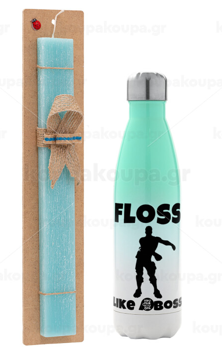 Fortnite Floss Like a Boss, Easter Set, Metallic green/white thermos (Stainless steel), double-walled, 500ml & scented flat Easter candle (30cm) (TURQUOISE)