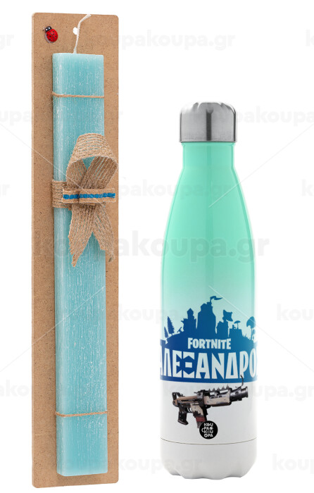 Fortnite with gun με το όνομα σου, Easter Set, Metallic green/white thermos (Stainless steel), double-walled, 500ml & scented flat Easter candle (30cm) (TURQUOISE)