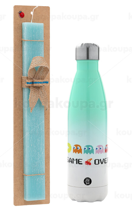 GAME OVER pac-man, Easter Set, Metallic green/white thermos (Stainless steel), double-walled, 500ml & scented flat Easter candle (30cm) (TURQUOISE)