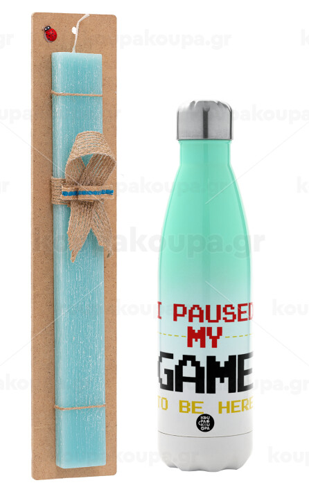 I paused my game to be here, Easter Set, Metallic green/white thermos (Stainless steel), double-walled, 500ml & scented flat Easter candle (30cm) (TURQUOISE)