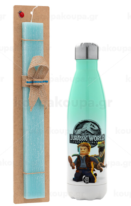 Jurassic world, Easter Set, Metallic green/white thermos (Stainless steel), double-walled, 500ml & scented flat Easter candle (30cm) (TURQUOISE)