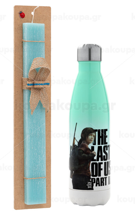 Last of us, Ellie, Easter Set, Metallic green/white thermos (Stainless steel), double-walled, 500ml & scented flat Easter candle (30cm) (TURQUOISE)