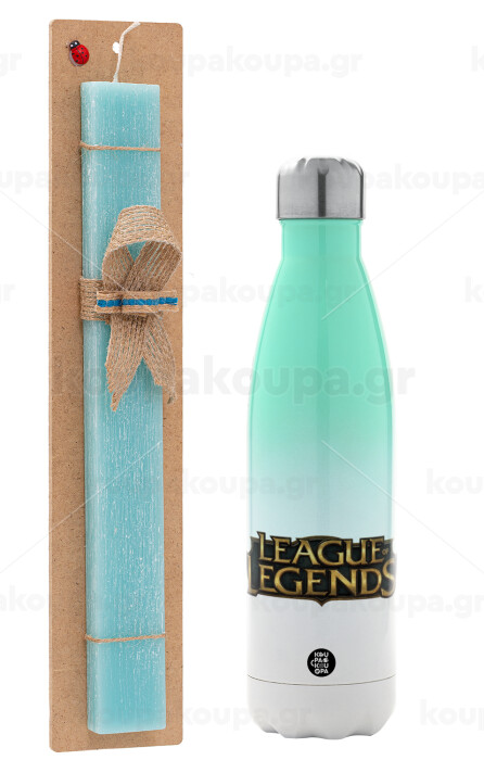 League of Legends LoL, Easter Set, Metallic green/white thermos (Stainless steel), double-walled, 500ml & scented flat Easter candle (30cm) (TURQUOISE)