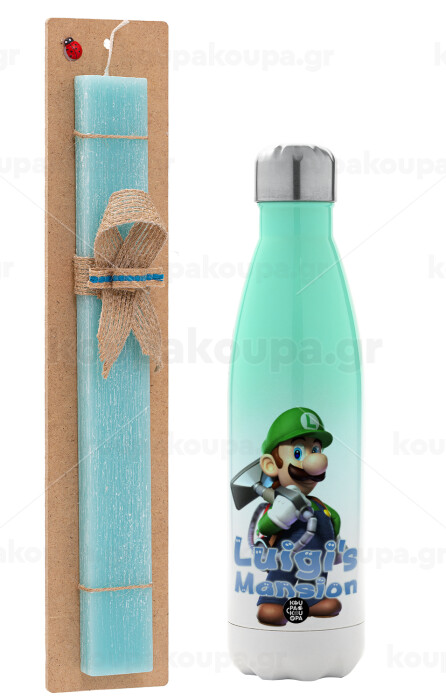 Luigi's Mansion, Easter Set, Metallic green/white thermos (Stainless steel), double-walled, 500ml & scented flat Easter candle (30cm) (TURQUOISE)