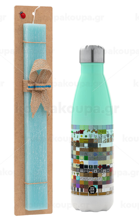 Minecraft blocks, Easter Set, Metallic green/white thermos (Stainless steel), double-walled, 500ml & scented flat Easter candle (30cm) (TURQUOISE)