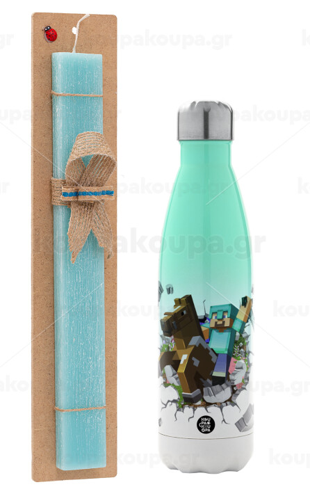 Minecraft brick, Easter Set, Metallic green/white thermos (Stainless steel), double-walled, 500ml & scented flat Easter candle (30cm) (TURQUOISE)