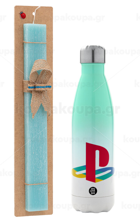 Playstation, Easter Set, Metallic green/white thermos (Stainless steel), double-walled, 500ml & scented flat Easter candle (30cm) (TURQUOISE)