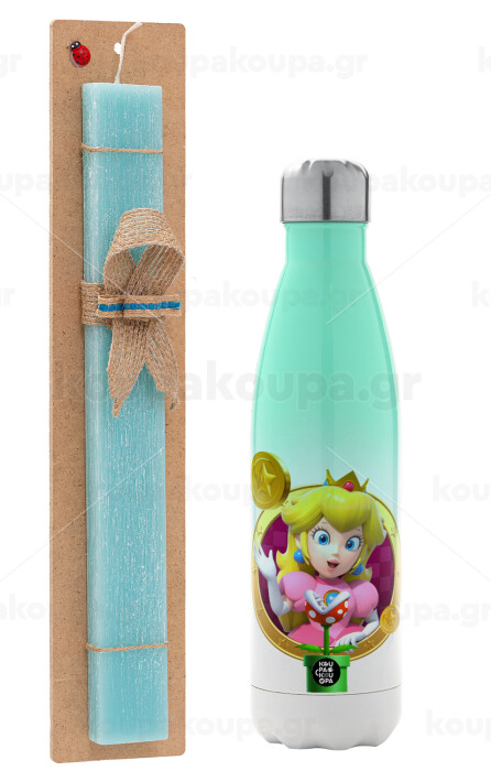Princess Peach Toadstool, Easter Set, Metallic green/white thermos (Stainless steel), double-walled, 500ml & scented flat Easter candle (30cm) (TURQUOISE)