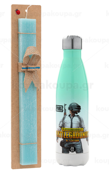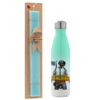 PUBG battleground royale, Easter Set, Metallic green/white thermos (Stainless steel), double-walled, 500ml & scented flat Easter candle (30cm) (TURQUOISE)