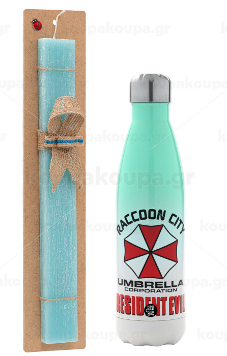 Resident Evil, Easter Set, Metallic green/white thermos (Stainless steel), double-walled, 500ml & scented flat Easter candle (30cm) (TURQUOISE)