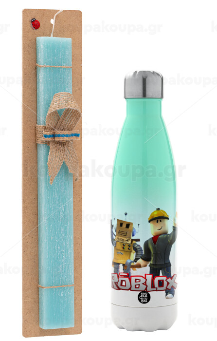 Roblox, Easter Set, Metallic green/white thermos (Stainless steel), double-walled, 500ml & scented flat Easter candle (30cm) (TURQUOISE)