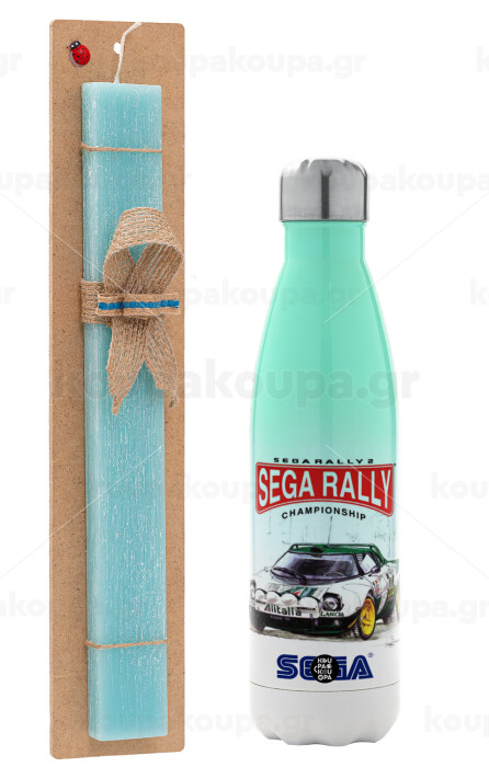SEGA RALLY 2, Easter Set, Metallic green/white thermos (Stainless steel), double-walled, 500ml & scented flat Easter candle (30cm) (TURQUOISE)