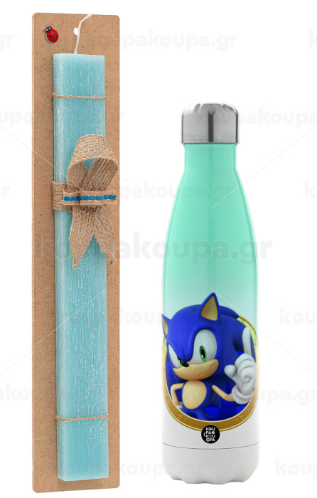 Sonic the hedgehog, Easter Set, Metallic green/white thermos (Stainless steel), double-walled, 500ml & scented flat Easter candle (30cm) (TURQUOISE)