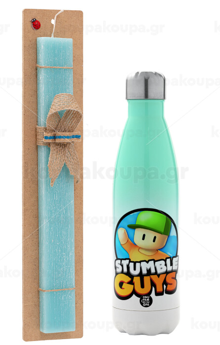 Stumble Guys, Easter Set, Metallic green/white thermos (Stainless steel), double-walled, 500ml & scented flat Easter candle (30cm) (TURQUOISE)