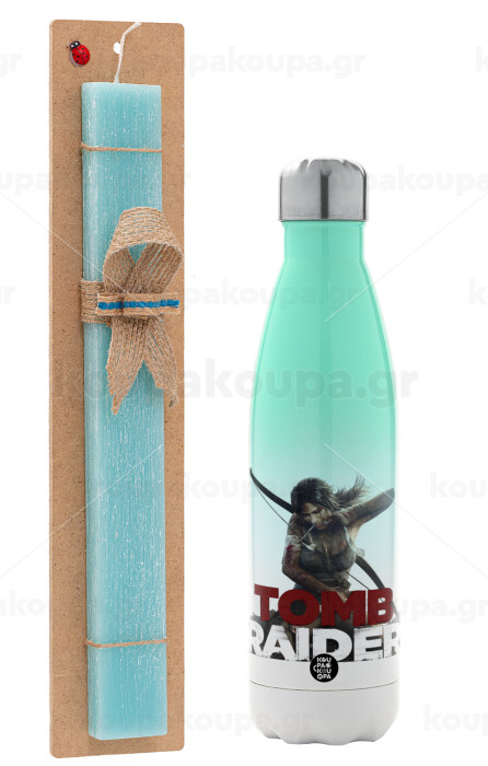 Tomb raider, Easter Set, Metallic green/white thermos (Stainless steel), double-walled, 500ml & scented flat Easter candle (30cm) (TURQUOISE)