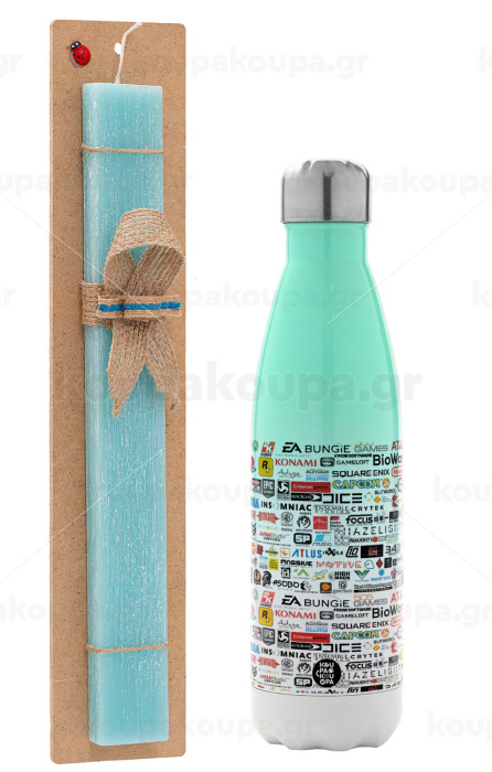 Video Game Studio Logos, Easter Set, Metallic green/white thermos (Stainless steel), double-walled, 500ml & scented flat Easter candle (30cm) (TURQUOISE)
