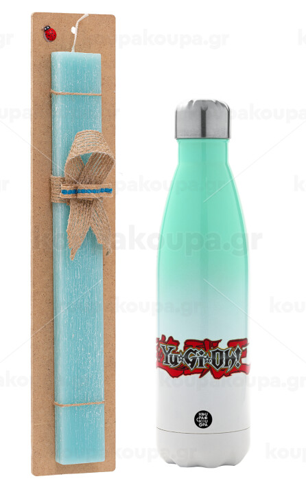 Yu-Gi-Oh, Easter Set, Metallic green/white thermos (Stainless steel), double-walled, 500ml & scented flat Easter candle (30cm) (TURQUOISE)