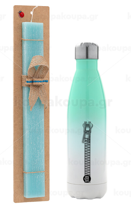 Zipper, Easter Set, Metallic green/white thermos (Stainless steel), double-walled, 500ml & scented flat Easter candle (30cm) (TURQUOISE)