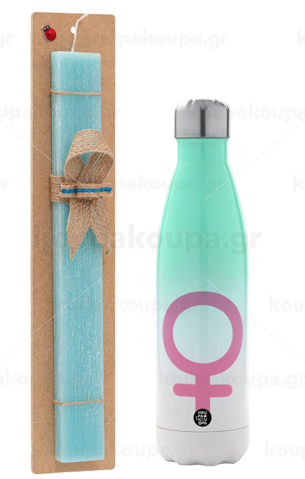 FEMALE, Easter Set, Metallic green/white thermos (Stainless steel), double-walled, 500ml & scented flat Easter candle (30cm) (TURQUOISE)