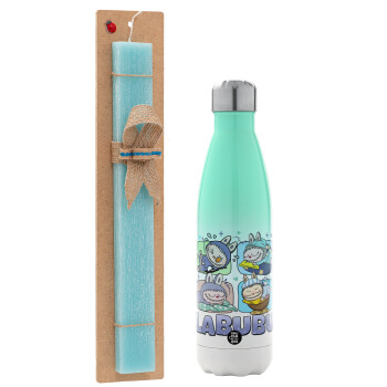 Labubu, Easter Set, Metallic green/white thermos (Stainless steel), double-walled, 500ml & scented flat Easter candle (30cm) (TURQUOISE)