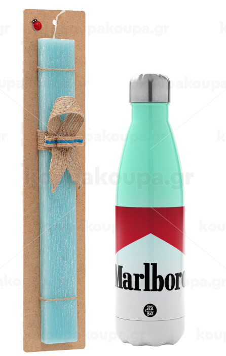Marlboro, Easter Set, Metallic green/white thermos (Stainless steel), double-walled, 500ml & scented flat Easter candle (30cm) (TURQUOISE)