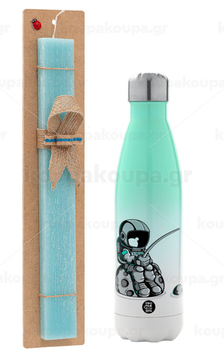 Little astronaut fishing, Easter Set, Metallic green/white thermos (Stainless steel), double-walled, 500ml & scented flat Easter candle (30cm) (TURQUOISE)