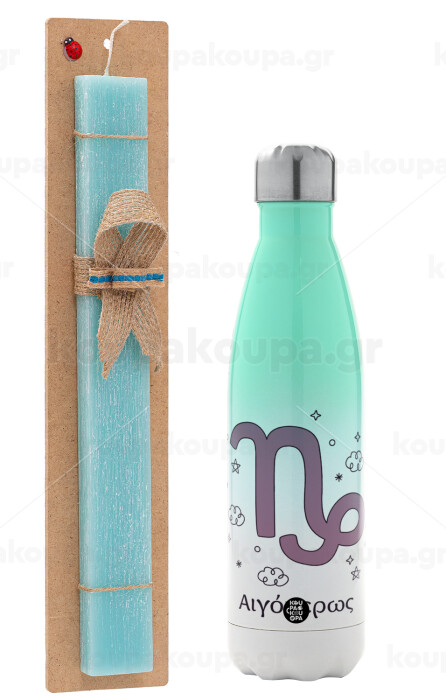 Ζώδια Αιγόκερως, Easter Set, Metallic green/white thermos (Stainless steel), double-walled, 500ml & scented flat Easter candle (30cm) (TURQUOISE)