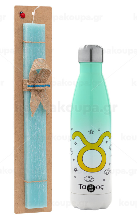 Ζώδια Ταύρος, Easter Set, Metallic green/white thermos (Stainless steel), double-walled, 500ml & scented flat Easter candle (30cm) (TURQUOISE)