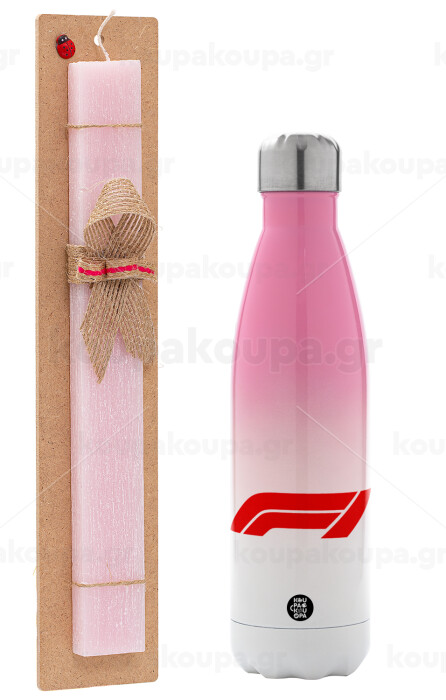 Formula 1, Easter Set, Metallic pink/white (Stainless steel) thermos, double-walled, 500ml & aromatic flat Easter candle (30cm) (PINK)