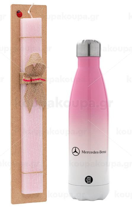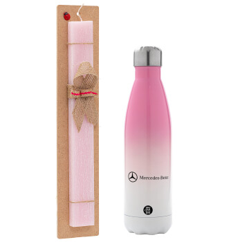 Mercedes small logo, Easter Set, Metallic pink/white (Stainless steel) thermos, double-walled, 500ml & aromatic flat Easter candle (30cm) (PINK)
