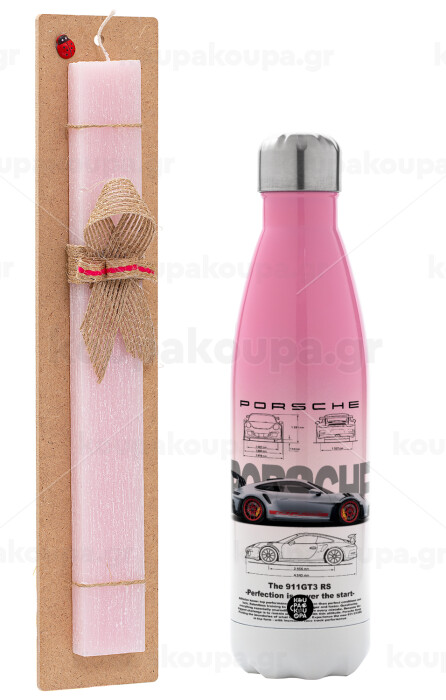 Porsche, Easter Set, Metallic pink/white (Stainless steel) thermos, double-walled, 500ml & aromatic flat Easter candle (30cm) (PINK)