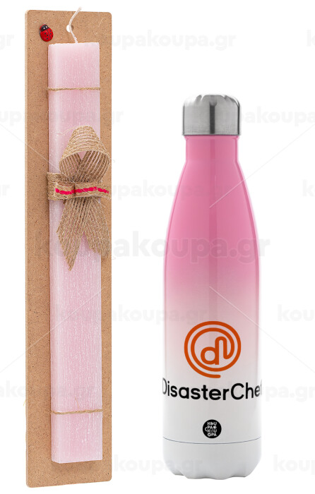 Disaster Chef, Easter Set, Metallic pink/white (Stainless steel) thermos, double-walled, 500ml & aromatic flat Easter candle (30cm) (PINK)