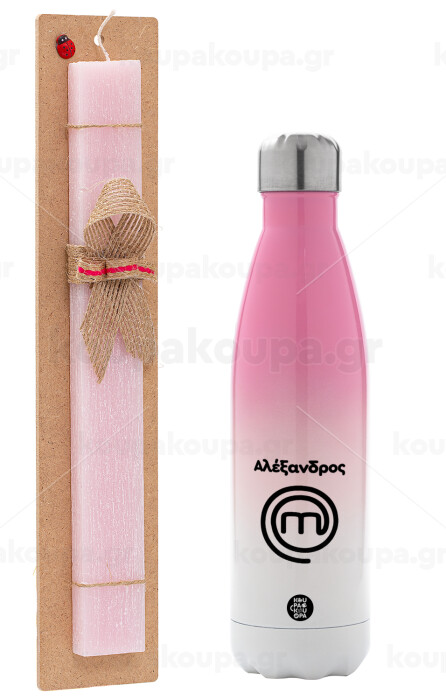 Master Chef Greece, Easter Set, Metallic pink/white (Stainless steel) thermos, double-walled, 500ml & aromatic flat Easter candle (30cm) (PINK)