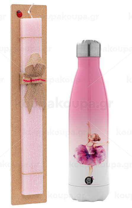 Ballerina watercolor, Easter Set, Metallic pink/white (Stainless steel) thermos, double-walled, 500ml & aromatic flat Easter candle (30cm) (PINK)