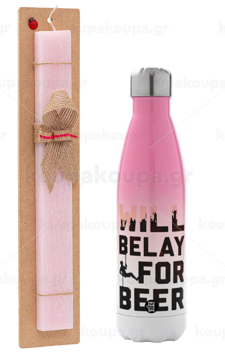Will Belay For Beer, Easter Set, Metallic pink/white (Stainless steel) thermos, double-walled, 500ml & aromatic flat Easter candle (30cm) (PINK)
