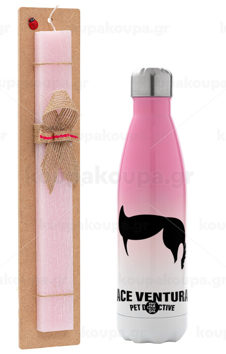 Ace Ventura Pet Detective, Easter Set, Metallic pink/white (Stainless steel) thermos, double-walled, 500ml & aromatic flat Easter candle (30cm) (PINK)