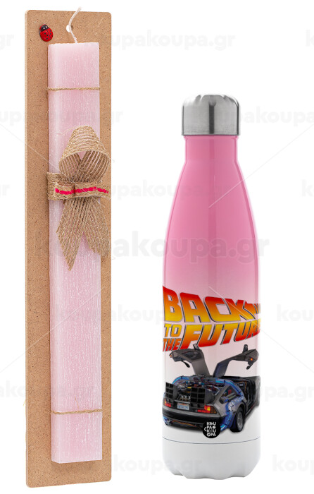 Back to the future, Easter Set, Metallic pink/white (Stainless steel) thermos, double-walled, 500ml & aromatic flat Easter candle (30cm) (PINK)