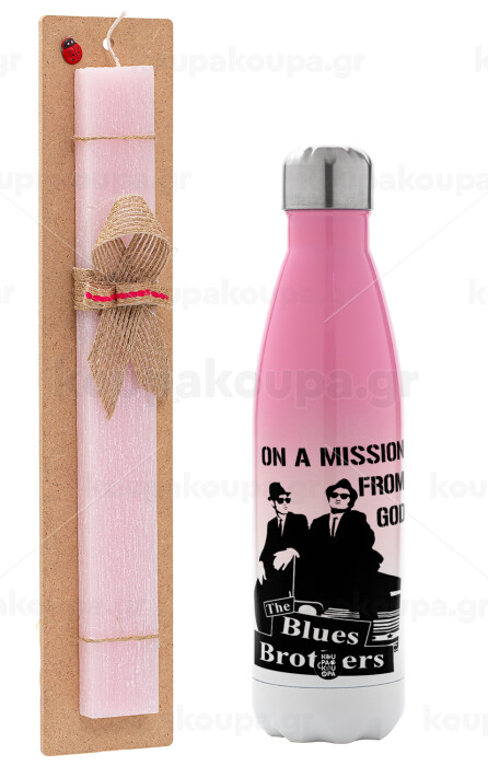 Blues brothers on a mission from God, Easter Set, Metallic pink/white (Stainless steel) thermos, double-walled, 500ml & aromatic flat Easter candle (30cm) (PINK)