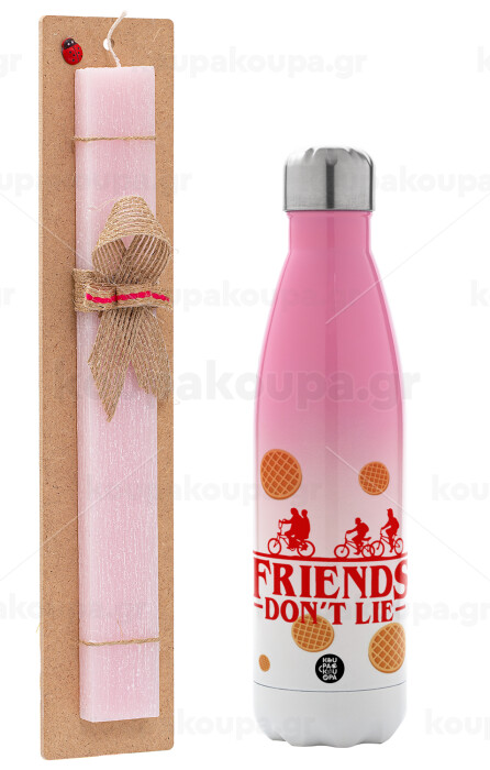 Friends Don't Lie, Stranger Things, Easter Set, Metallic pink/white (Stainless steel) thermos, double-walled, 500ml & aromatic flat Easter candle (30cm) (PINK)