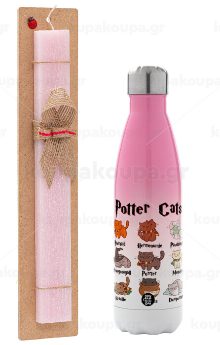 Potter Cats, Easter Set, Metallic pink/white (Stainless steel) thermos, double-walled, 500ml & aromatic flat Easter candle (30cm) (PINK)