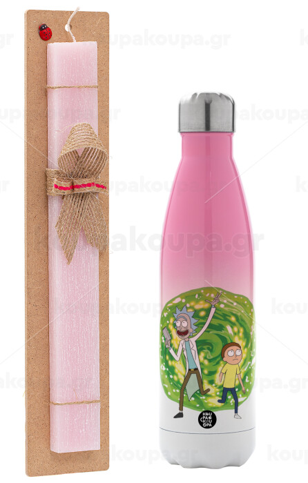Rick and Morty, Easter Set, Metallic pink/white (Stainless steel) thermos, double-walled, 500ml & aromatic flat Easter candle (30cm) (PINK)