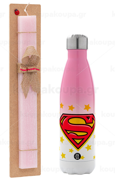 Superman Blue, Easter Set, Metallic pink/white (Stainless steel) thermos, double-walled, 500ml & aromatic flat Easter candle (30cm) (PINK)