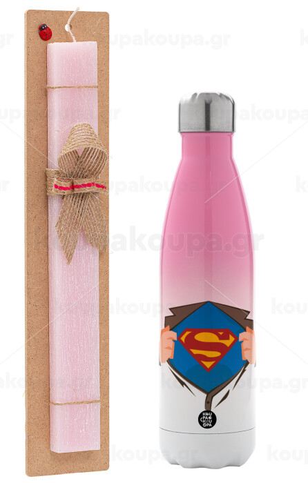Superman hands, Easter Set, Metallic pink/white (Stainless steel) thermos, double-walled, 500ml & aromatic flat Easter candle (30cm) (PINK)