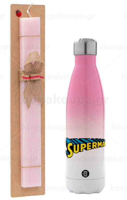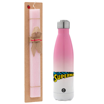 Superman vintage, Easter Set, Metallic pink/white (Stainless steel) thermos, double-walled, 500ml & aromatic flat Easter candle (30cm) (PINK)