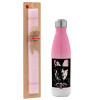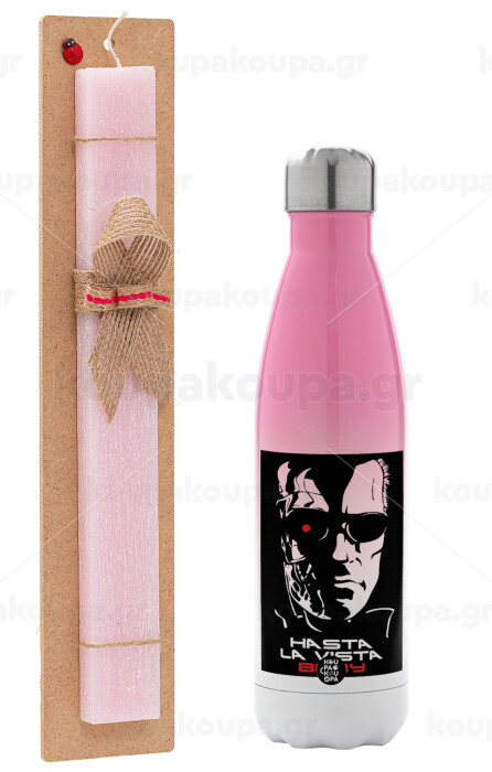 Terminator Hasta La Vista, Easter Set, Metallic pink/white (Stainless steel) thermos, double-walled, 500ml & aromatic flat Easter candle (30cm) (PINK)