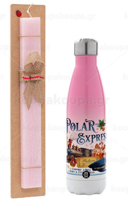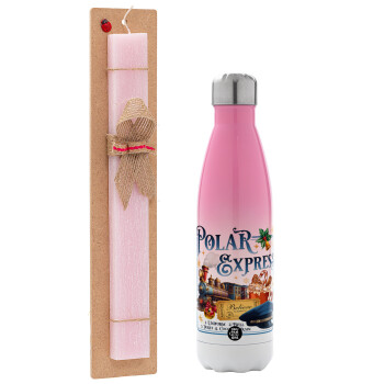 The Polar Express, Easter Set, Metallic pink/white (Stainless steel) thermos, double-walled, 500ml & aromatic flat Easter candle (30cm) (PINK)
