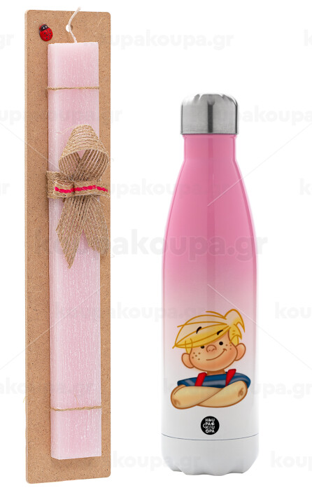 Dennis the Menace, Easter Set, Metallic pink/white (Stainless steel) thermos, double-walled, 500ml & aromatic flat Easter candle (30cm) (PINK)