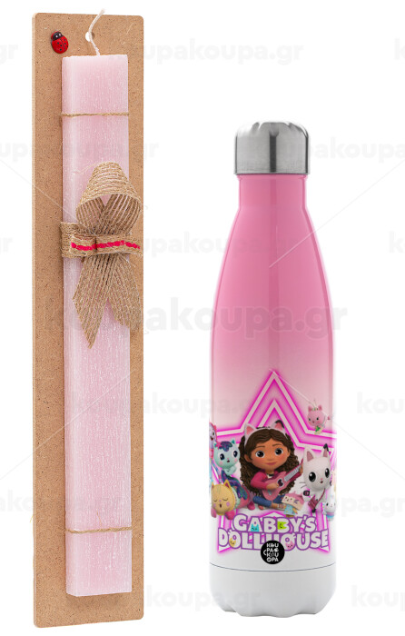 Gabby Dollhouse, Easter Set, Metallic pink/white (Stainless steel) thermos, double-walled, 500ml & aromatic flat Easter candle (30cm) (PINK)