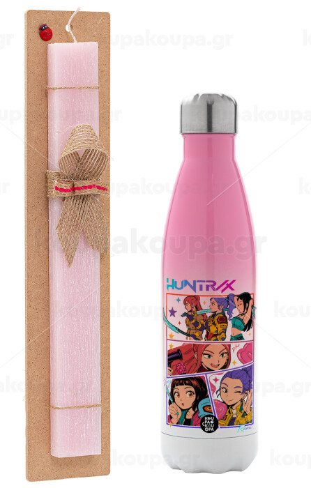 Huntrix Kpop Girls, Easter Set, Metallic pink/white (Stainless steel) thermos, double-walled, 500ml & aromatic flat Easter candle (30cm) (PINK)