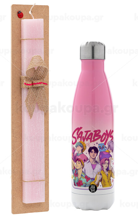 Huntrix Saja Boys, Easter Set, Metallic pink/white (Stainless steel) thermos, double-walled, 500ml & aromatic flat Easter candle (30cm) (PINK)